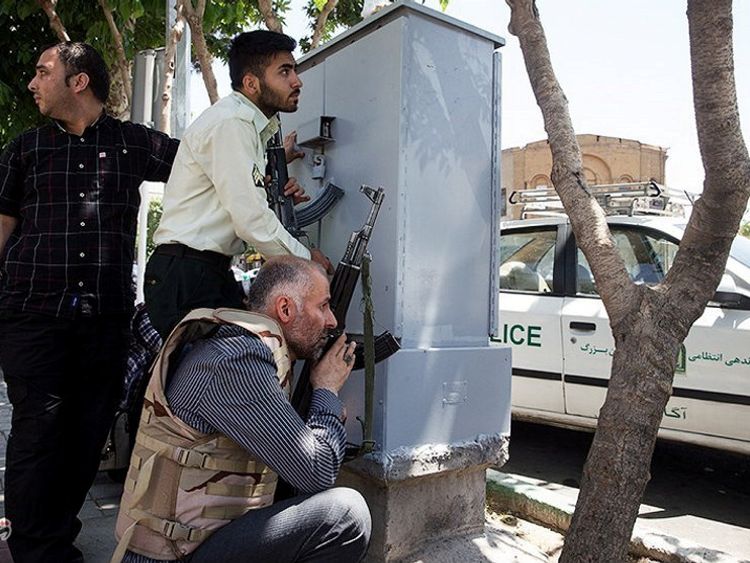 Image:Members of Iranian forces take cover during an attack on the Iranian parliament IS, a Sunni organisation, has been losing ground in both countries.